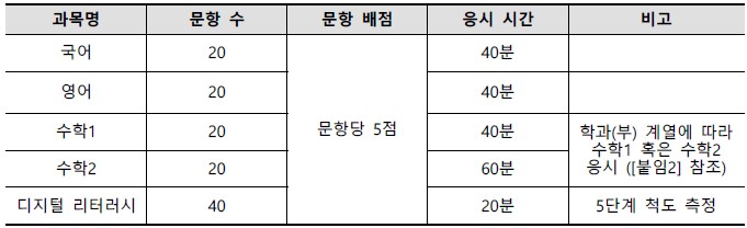 신입생들이 4과목(국어, 영어, 수학, 디지털 리터러시)에 의무적으로 응시하시기 바랍니다.