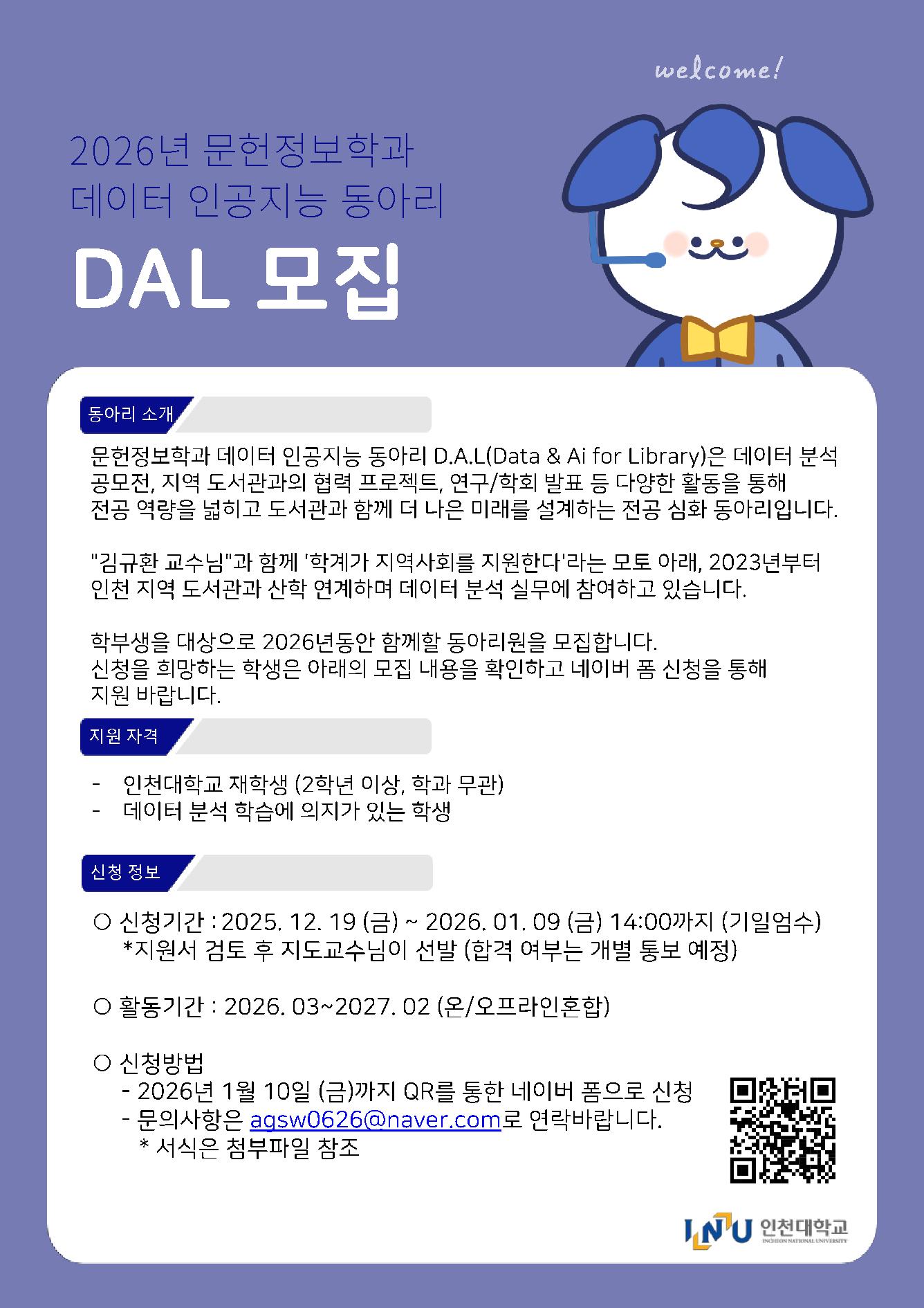 fnctId=bbs,fnctNo=319 [모집] [DAL] 2026 동아리원 모집공고 글번호 416686 작성일 2025-12-19 수정일 2025-12-19 작성자 문헌정보학과 (032-835-8750) 조회수 188 첨부파일 첨부파일이(가) 없습니다. 다음글 [모집] 2025년 사회공헌 활동 사례 발굴 공모전 참가자 모집 안내 김현희 2025-12-19 14:48:20.0 이전글 [안내] 2025학년도 동계 계절학기 재수강(수기) 신청 안내 김현희 2025-12-15 15:07:53.0 목록